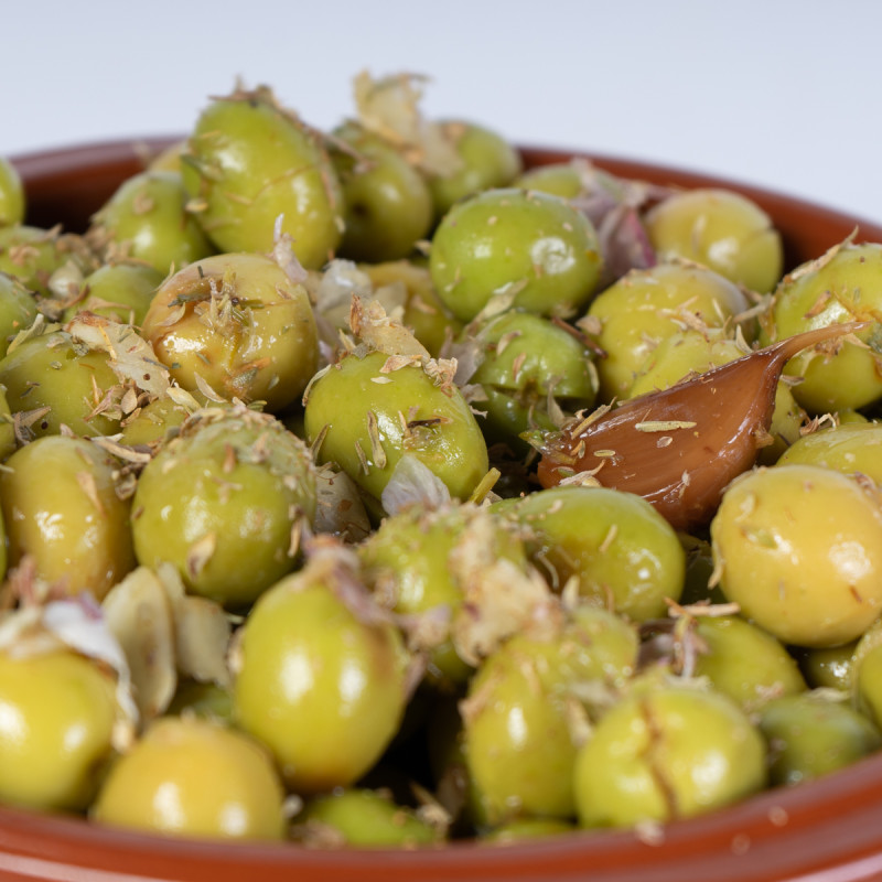 Aceitunas verdes machacadas. Se trata de aceitunas naturales, con las que utilizamos un aliño especial en el que intentamos que brille el sabor de las aceitunas por encima de todo.